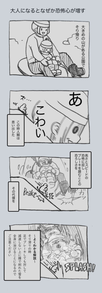 【育児漫画】そり滑りにブレーキ ダメ、絶対 デテぽこ漫画 X Facebook はてブ Pocket LINE コピー 2022.02.142025.08.10 記事内に広告が含まれています 足で減速しようとしても全く勢いが落ちないし、ただ地面の雪をかきあげてそれを浴びる羽目になるのでやめた方がいいですよ!💦(数年に1回はやらかす) 大人になってから恐怖心が強くなったような・・・そり滑りの他にも急勾配な滑り台とか、絶叫マシーンとかが怖いです。 自分のコントロールが効かないものが嫌なんだろうなとは思います。子どもが怪我するところを想像しちゃう・・・ゾゾゾ😰
